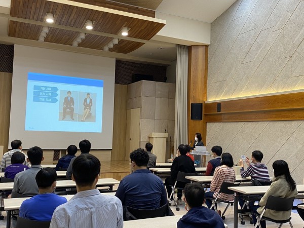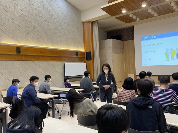 또한, 상대방에게 '나의 인상'을 긍정적으로 보일 수 있도록 하는 대화 방법, 대화할 때 상대방의 눈을 바라보고 미소 짓는 연습도 서로 짝을 이루어 실습해 보았습니다.