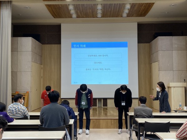 인사하기, 표정 짓기, 자세 등을 통해 자신의 이미지를 면접관에게 호감 가는 이미지로 나타내는 방법을 배웠습니다.