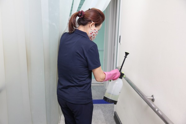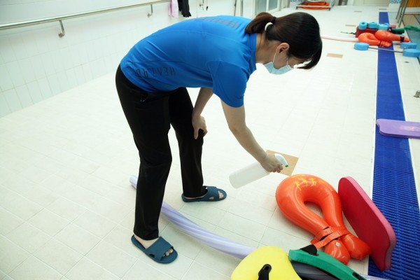 수중재활센터 입장 시 발열체크는 기본, 매시간 프로그램 시작 전과 종료 시마다 이용자가 사용한 기구 소독, 탈의실 및 샤워실 소독, 특히 샤워실은 샤워커튼으로 공간을 최대한 분리하였고, 이용자가 사용한 공간 곳곳을 위생적으로 관리하고 있습니다.