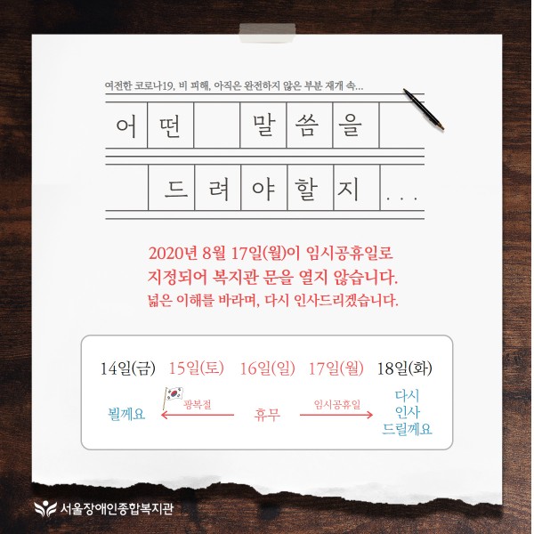 2020년 8월 17일(월)이 임시공휴일로 지정되어 복지관 문을 열지 않습니다.