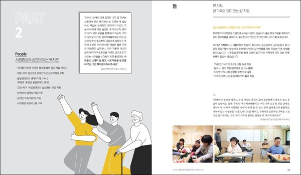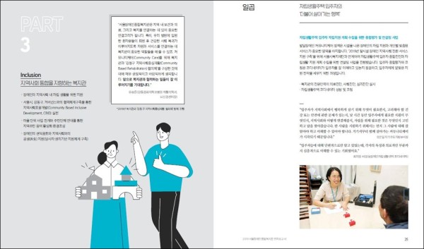 6개 사업 부서(능력향상촉진부, 자기주도지원부, 직업지원부, 공유자원부, 지역포괄촉진부, 건강증진부)의 협조를 받아 기획협력팀이 제작하고, 디자인업체 ‘그래픽오션’이 편집디자인과 인쇄를 진행했습니다.