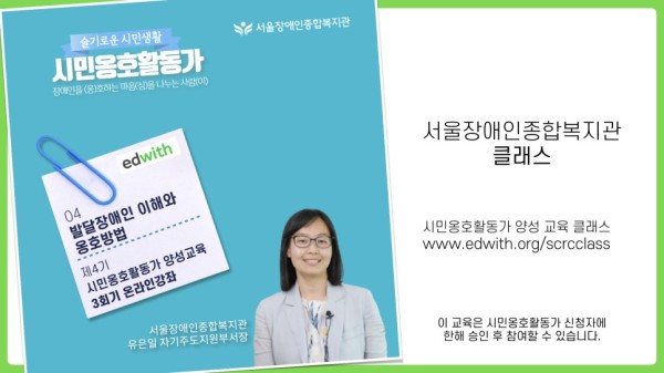 3. 서울장애인종합복지관 클래스 : 에드위드 내 만든 서울장애인종합복지관 온라인 강의 이름. 단, 시민옹호활동가 사전 신청자에 한해 관리자 승인 후 강의 영상을 시청 및 수료 할 수 있습니다.