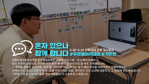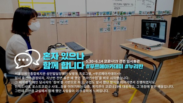 "혼자 있으나 함께 합니다"-코로나19 관련 임시휴관 속 서울장애인종합복지관 푸르메아카데미 '온라인수업' 재… 페이지 정보 작성자 서울장애인복지관 작성일20-06-03 14:20 조회수1,307 본문 자세히 보기"혼자 있으나 함께 합니다"-코로나19 관련 임시휴관 속 서울장애인종합복지관 푸르메아카데미 '온라인수업' 재개 서울장애인종합복지관 성인발달장애인 낮활동 프로그램, <푸르메아카데미>는임시 휴관이 결정되자, 지난번 전면 휴관 때 했던 '온라인수업'을 바로 시작했습니다.그 때처럼 장애인 당사자의 '참여'를 기반으로 하고, 수업도 앞서 했던 방식을 이어가면서 진행하였지요.언택트시대, 포스트코로나 시대...등을 이야기하는 요즘, 복지관이 코로나19에 대응하고, 그 과정에 얻은 배움입니다.그런데 그만큼 교실에서 함께 했던 사람들이 더 소중하게 느껴집니다. 문의 : 02-440-5845,6 (서울장애인종합복지관 자기주도지원부 PCP낮활동지원팀) 자세히 보기 목록 답변 이전글 [8분] 쉬운 글, 간단한 그림으로 소개하는 서울장애인종합복지관 [클로바더빙 AI 보이스예요] 20.06.04 다음글 "더디 가고 있지만, 멈춘 것은 아닙니다."-'지역복지 이야기마당'회의 20.06.03