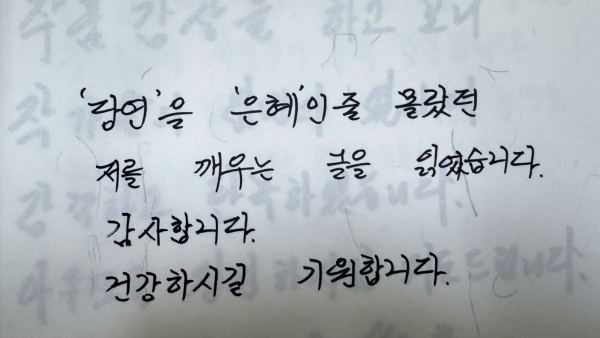 고덕평생학습관 방명록을 가득 채운 여러 소감문 중 하나입니다.