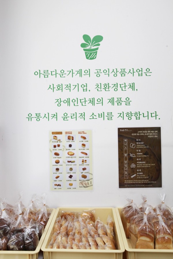 하루 동안, 아름다운가게 강동구청역점의 한 공간을 갓 만든 따뜻한 빵과 쿠키가 진열되어 오가는 사람들의 시선을 끌었습니다.