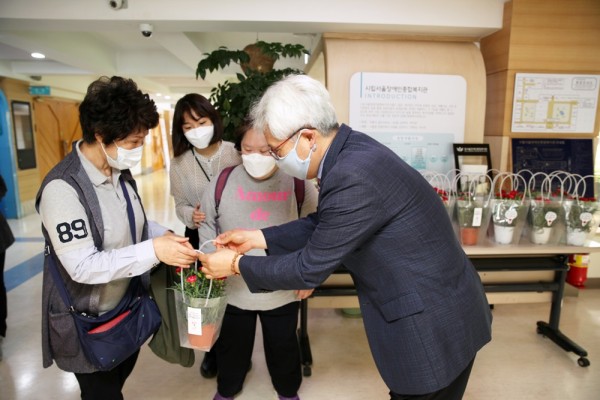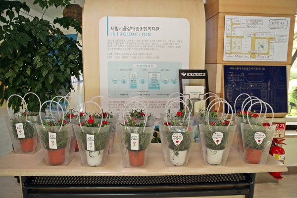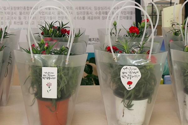 카네이션 화분은 복지관의 가까운 이웃 지역사회 하남시에서 ‘렛츠플라워’와 ‘스페셜게스트’라는 업체를 운영하는 부부 안영태 님과 박해랑 님이 특별히 기증한 것입니다.