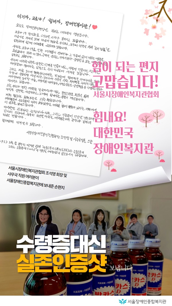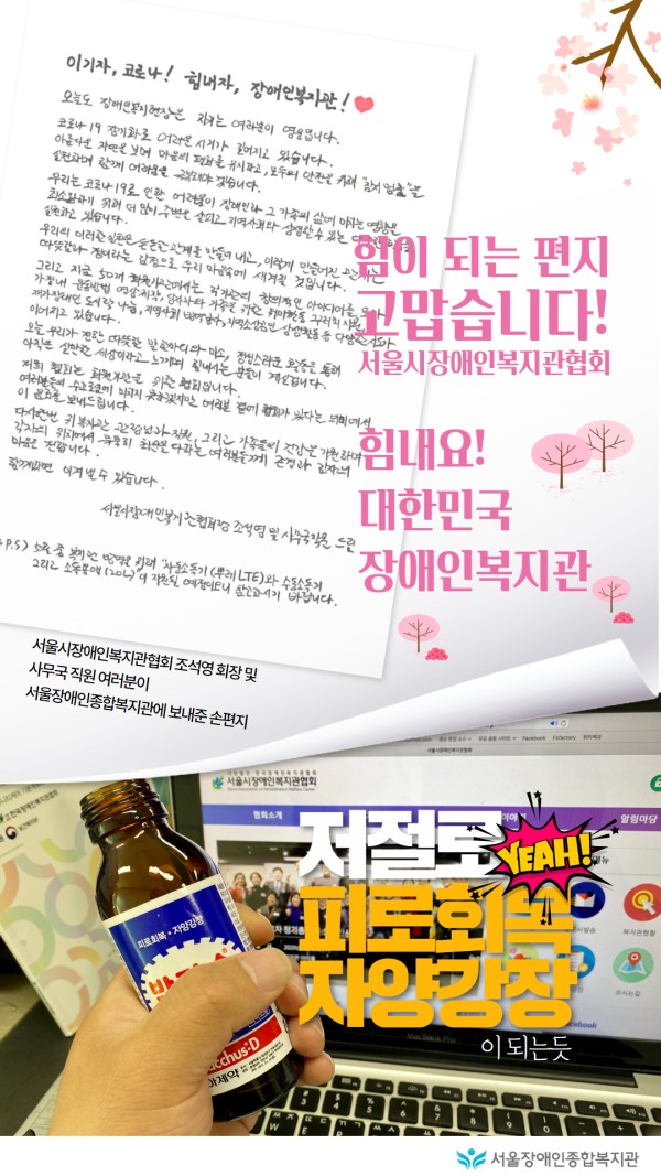 힘이 되는 편지와 피로회복과 자양강정에 효능이 있다고 알려진 음료 고맙습니다! 서울시장애인복지관협회!