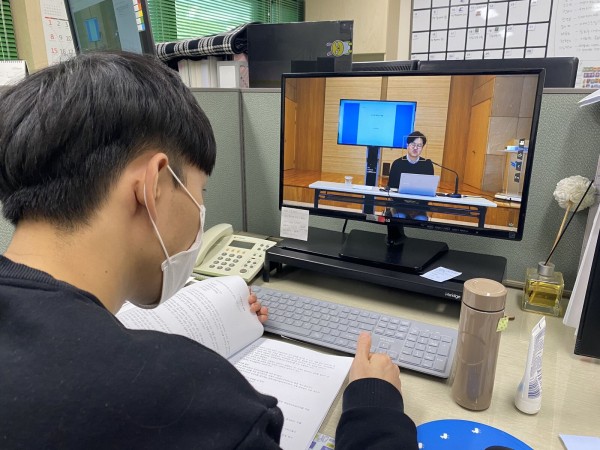 사진_사무실에서 개인 휴대전화로 교육을 보는 직원