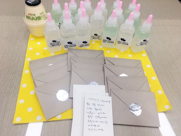 4개의 손소독제 중 복지관에 하나씩, 이렇게 많은 분들이 복지관에 손소독제와 엽서를 보내주셨습니다.