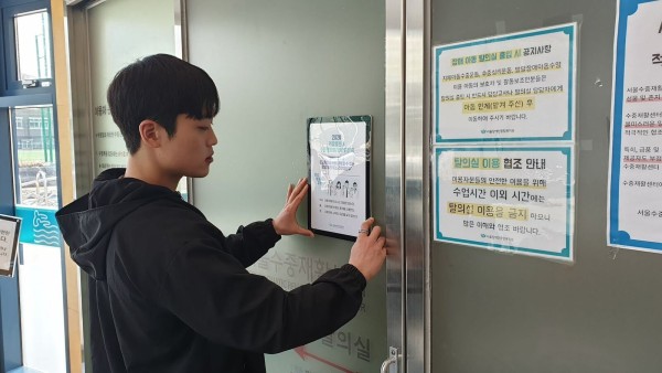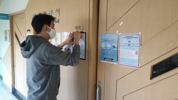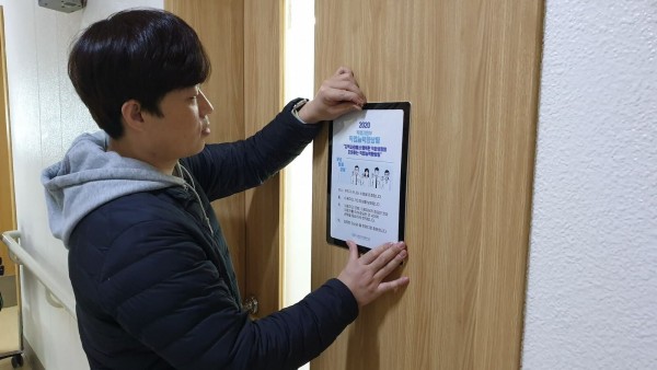 (사진_건강증진부 윤리행동강령을 부착하는 복지관 직원)