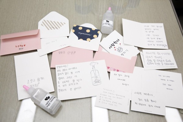 “안녕하세요? 우리 코로나 바이러스 걸리지 말고 잘 이겨냅시다. 그리고 이 손소독제를 잘 발라서 우리 오래오래 행복하게 잘 삽시다.” 라고 썼고,