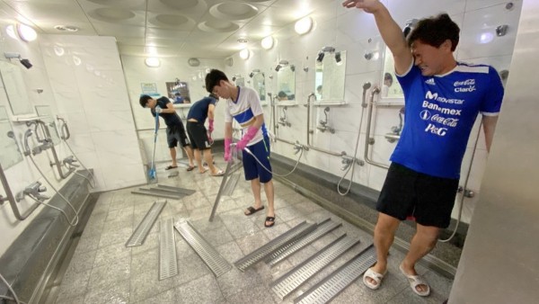 (사진3_수중재활센터 샤워실을 청소, 소독하는 건강증진부 직원들