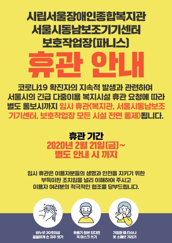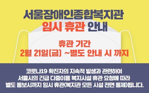 2월 21일(금)부터 서울장애인종합복지관이 임시 휴관됨을 알려드립니다.