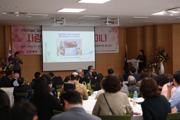 장애인 당사자 본인을 중심에 두고 그들이 자기 인생을 어떻게 주도적으로 설계하고 삶을 주체적으로 살아갈 수 있는지에 대한 방향을 제시하기 위해 3일간 열리는 세미나는 1일 차인 14일 오전 10시부터 12시까지 강동구청 5층 대강당에서 개회식, 우성장애인요양원 강순옥 원장의 '미국발달장애인 커뮤니티리빙정책 미국 워싱턴 D.C 연수보고'(이하 연수 보고) 발표에 이어서 마이클 스멀 교수의 선진 발달장애인 정책에 대한 특강이 이어졌습니다.