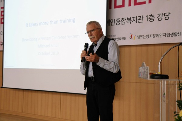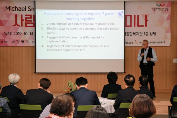이어서 진행된 마이클 스멀 교수의 '훈련, 그 이상의 것(It take more than training) 사람중심체계 개발하기'에서 그는 '사람중심체계가 요구하는 7가지 부분'과 '사람중심계획의 핵심개념'에 대해 설명하며 "강동구청장의 리더십과 강동커뮤니티리빙네트워크 구성이 참 인상 깊습니다.", "긍정적인 변화를 구상하고, 고민해야 합니다. 새로운 것을 할 때는 저항이 있기 마련입니다. 하지만, 변화를 통한 긍정적인 변화를 그리고, 저항을 하나씩 이겨나간다면 결국 장애인 당사자의 삶을보다 가치 있게 만들어 갈 것입니다."라며 강동구 사람 모두에게 응원과 격려의 메시지도 전했습니다.