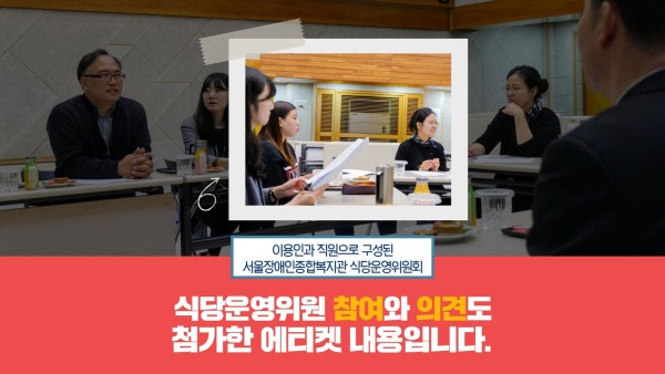 에티켓 내용보다 더 의미가 있는 것은 내용 작성 과정에 복지관 식당운영위원회 내 이용자 운영위원의 참여와 의견을 반영한 결과물입니다.