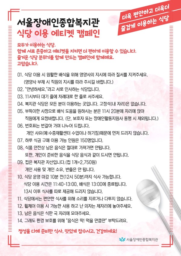 [내용] 서울장애인종합복지관 식당 이용 에티켓 캠페인 모두가 이용하는 식당. 함께 서로 존중하고 에티켓을 지키면 더 편하게 이용할 수 있습니다. 즐거운 식당 분위기를 함께 만드는 캠페인에 함께해요. 고맙습니다. 01. 식당 이용 시 원활한 배식을 위해 영양사의 지시에 따라 질서를 지켜주세요. (영양사 부재 시 직원의 지시를 따라 주시길 바랍니다.) 02. “안녕하세요.”라고 서로 인사하는 식당입니다. 03. 11시부터 대기 줄에 차례대로 한 줄로 서주세요. 04. 복지관 식당은 모든 분이 이용하는 곳입니다. 고정석(내 자리)은 없습니다. 05. 부득이한 사정으로 배식 도움을 원하시는 분은 11시 20분에 자리에 앉아 직원에게 요청바랍니다. (단, 보호자 또는 장애인활동지원사 동행 시 제외됩니다.) 06. 번호표는 번갈아 가며 나누어 드립니다. 개인 사유(예:수중재활센터 수업이나 허기짐)때문에 먼저 드리지 않습니다. 07. 하루 식권 구매 이용 가능 인원은 150명입니다. 08. 식품 안전상 남은 음식은 절대로 가져가면 안됩니다. 또한, 개인이 준비한 음식을 식당 음식과 같이 드시면 안됩니다. 09. 컵은 복지관 자산입니다.(컵 1개=2,750원) 개인 사용 및 개인 소유, 반출은 안 됩니다. 10. 식당 운영 마감 10분 전(12시 50분)까지 식사 가능합니다. 식당 이용 시간은 11:40-13:00, 배식은 13:00에 종료됩니다. 13시 이후 식사를 따로 제공해 드리지 않습니다. 11. 식당에서는 편안한 식사를 위해 소리를 지르거나 다투지 않습니다. 12. 휠체어 이용 시 가능한 사용 하고 난 의자는 제자리에 놓아주세요. 13. 남은 음식은 식판 국 자리에 모아주세요. 14. 그래도 환경 보호를 위해 “음식은 딱! 먹을 만큼만” 부탁드려요. 정성을 다해 준비한 식사, 맛있게 잡수시고, 건강하세요!