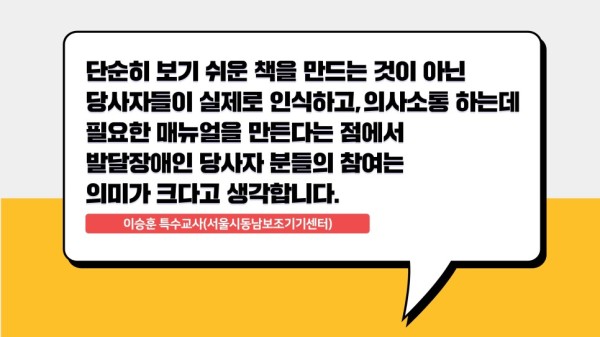 "단순히 보기 쉬운 책을 만드는 것이 아닌 당사자들이 실제로 인식하고, 의사소통 하는데 필요한 매뉴얼을 만든다는 점에서 발달장애인 당사자 분들의 참여는 의미가 크다고 생각합니다." - 이승훈 특수교사(서울시동남보조기기센터)