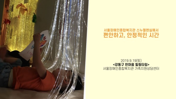 서울장애인종합복지관 가족지원상담센터에서 진행하는 '강동구 한마음 힐링타임'(강동구 지원 프로그램, 이하 힐링타임)은 '장애 자녀 돌봄 프로그램'입니다. 장애 자녀를 양육하는 부모님들에게 휴식과 여가를 제공하고, 장애 자녀들과는 심리운동과 체육활동을 진행하면서 주말을 활용하여 가족 모두 행복한 시간과 경험을 나누는 프로그램입니다.
