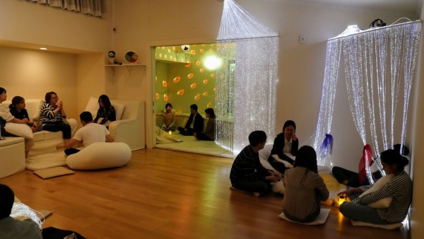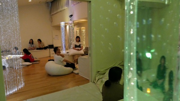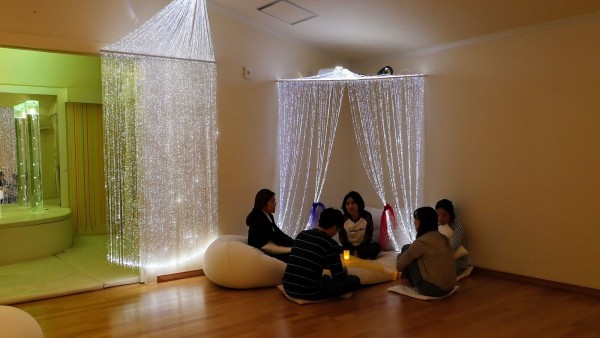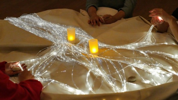 사진_광섬유와 조명이 놓인 쿠션에 둘러앉아 대화를 나누는 참가자들