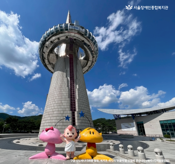 대전 한빛탑을 배경으로 서울장애인종합복지관 캐릭터인 '한울이'가 사진을 찍는 모습을 구글 나노바나나로 제작했습니다.